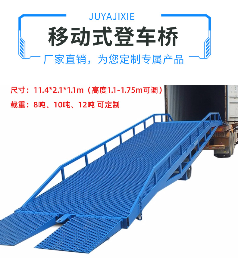 移动式登车桥(又称移动液压登车桥、无月台卸货平台)是无需固定土建、可灵活转移的液压装卸辅助设备,通过调节桥面高度,让前端唇板紧密搭接货车车厢,消除地面与车厢的高度差和间隙,使叉车能直接驶入车厢批量装卸;主打无固定月台、多点位流动、临时作业的场景,彻底省去二次搬运,大幅提升效率、降低人工成本。